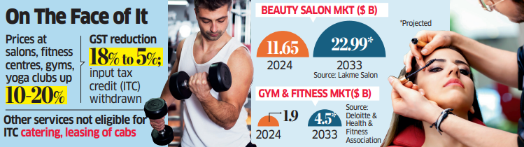 New Delhi: Most salon chains, fitness centres, gyms and yoga clubs across the country have raised prices by 10-20% despite the reduction in goods and services tax (GST) rate to 18% from 5% from September 22, citing the simultaneous withdrawal of the option to claim an input tax credit (ITC).